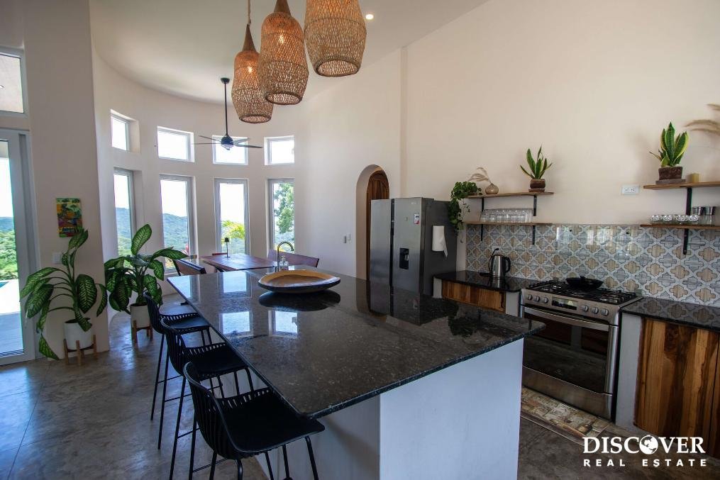 The open-concept kitchen with central island flows seamlessly into dining and living spaces, extending to a covered terrace with panoramic ocean, valley, and distant volcano views. A feast for the eyes, morning till night, with birds surfing the thermals and clourful cloud displays at sunrise & sunset.