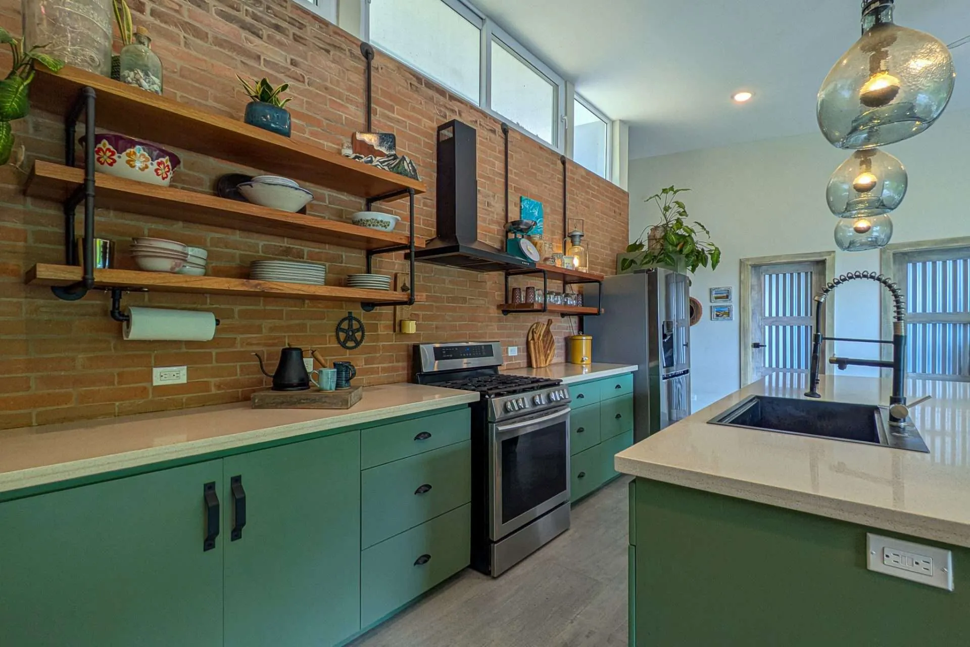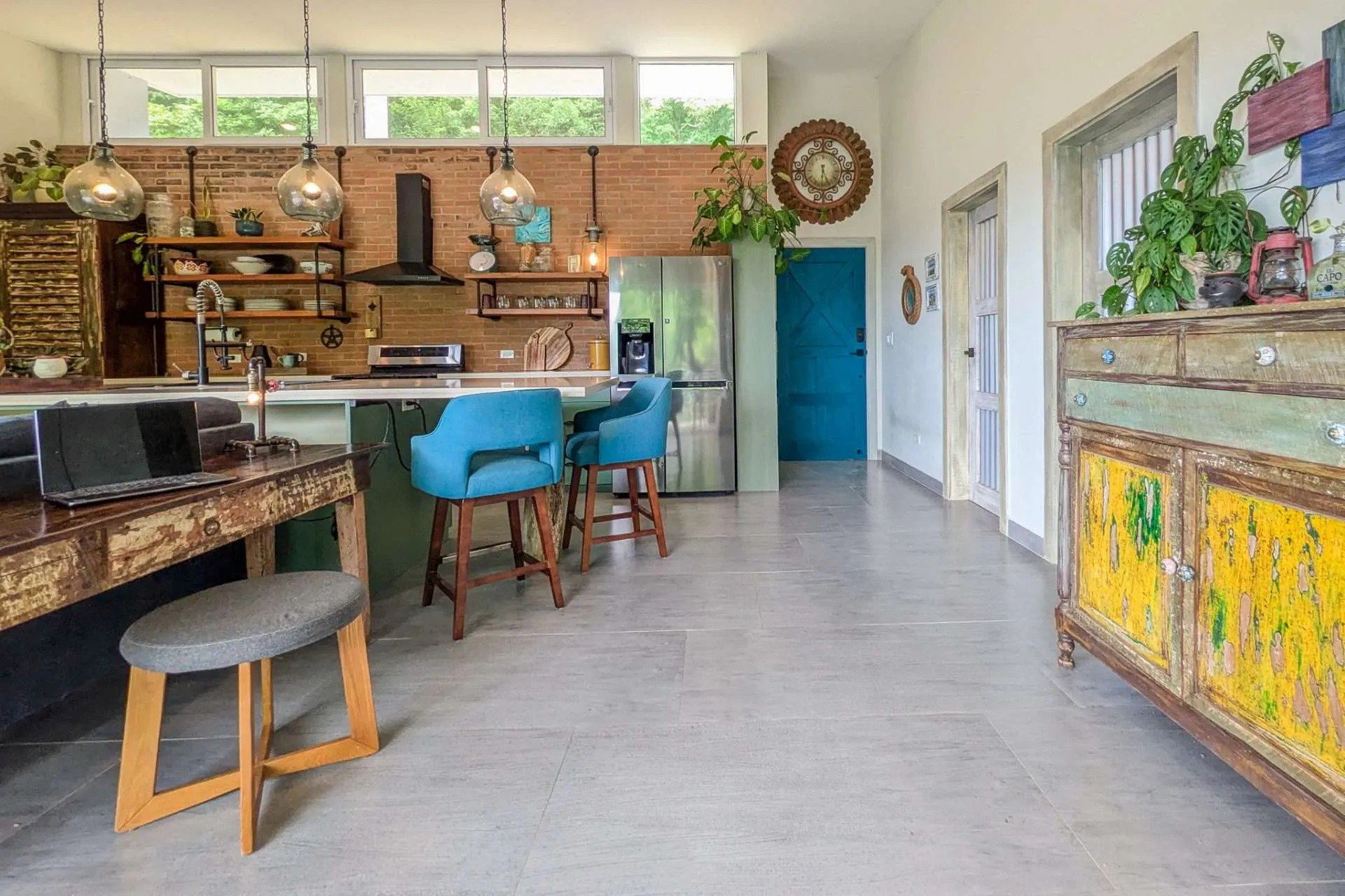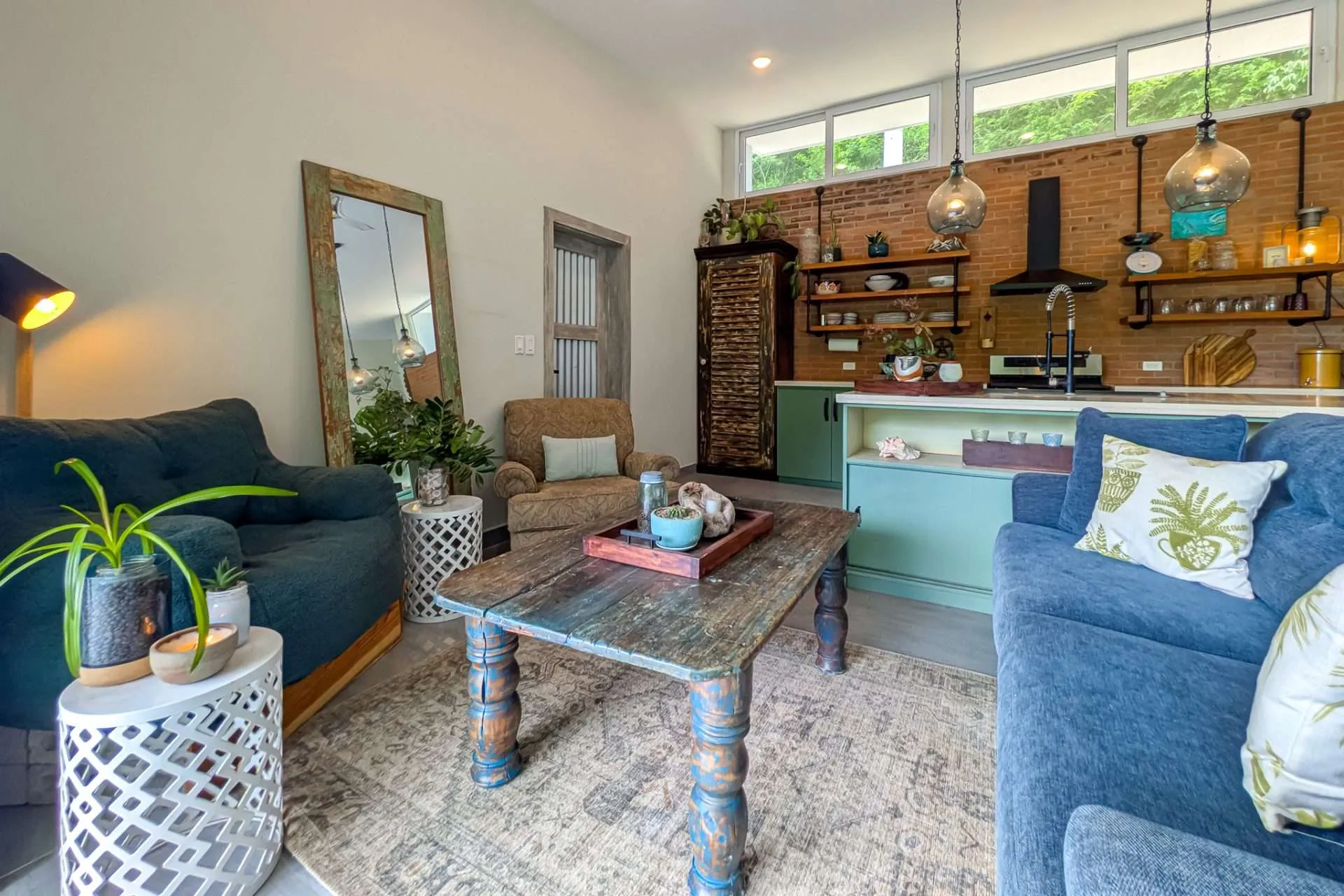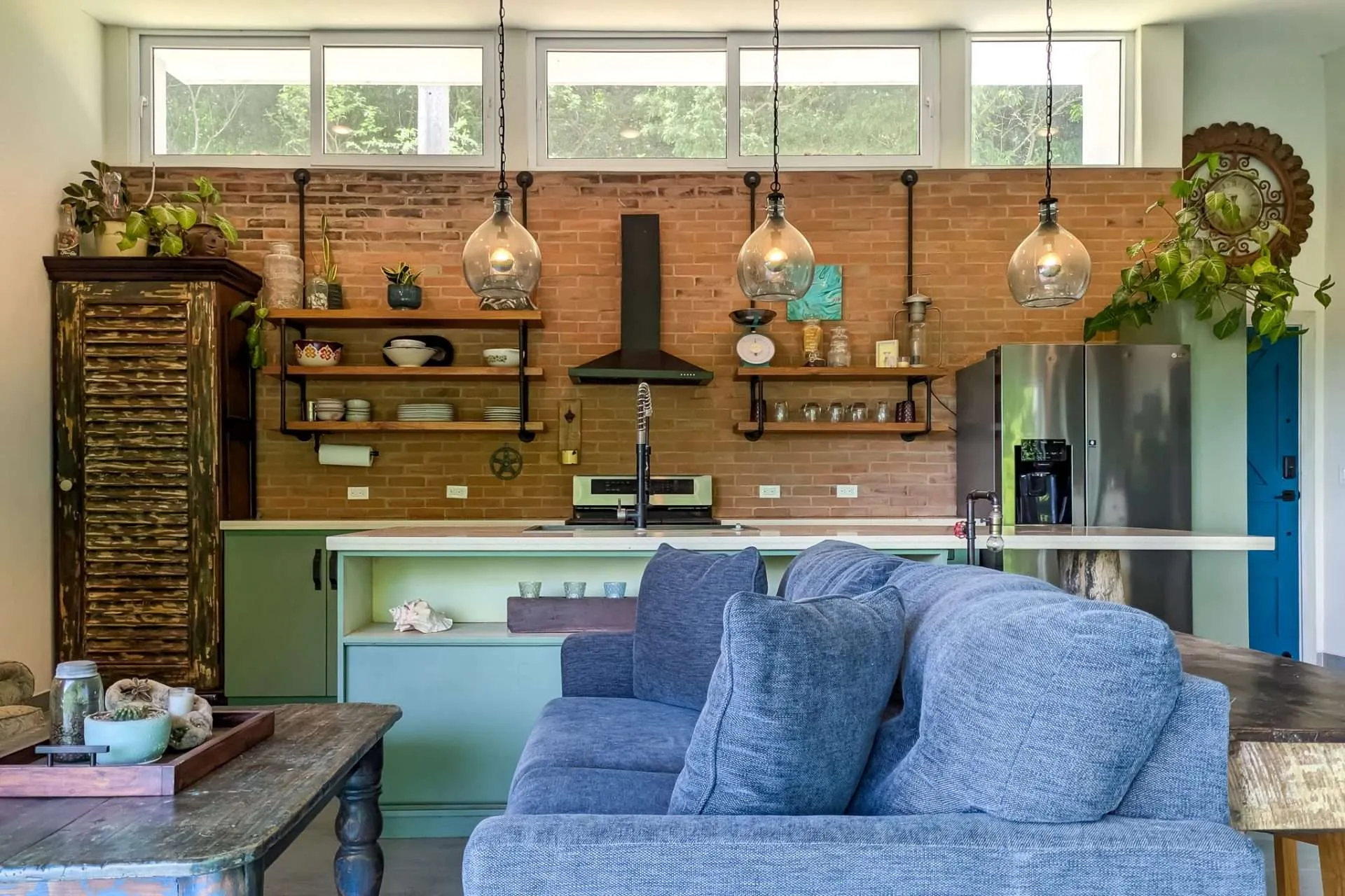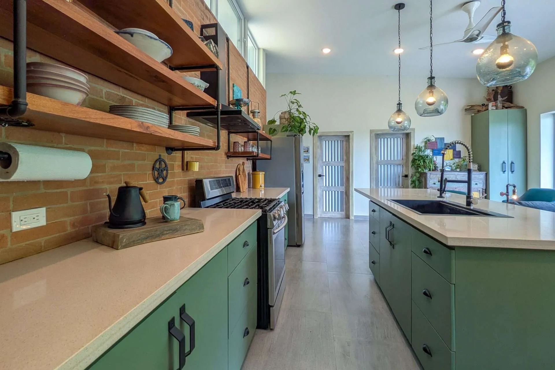 The heart of the home is an open-concept space centered around a beautiful island kitchen, featuring quartz countertops, solid wood cabinets, open shelving, and high-quality stainless steel appliances. The indoor living area sits directly adjacent to the kitchen, creating a natural flow for everyday living and entertaining. A dedicated desk area provides the perfect place to work or plan your next adventure.