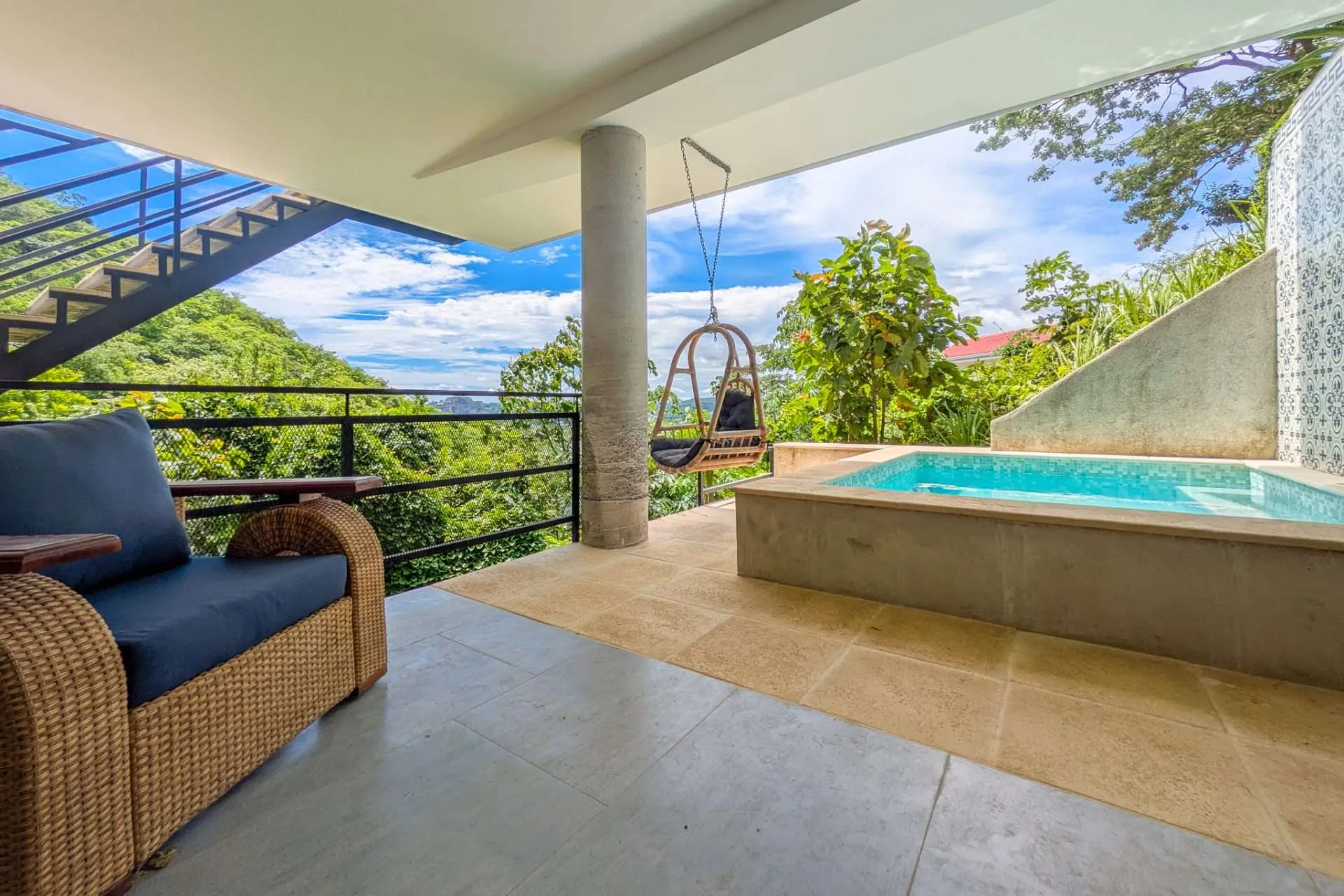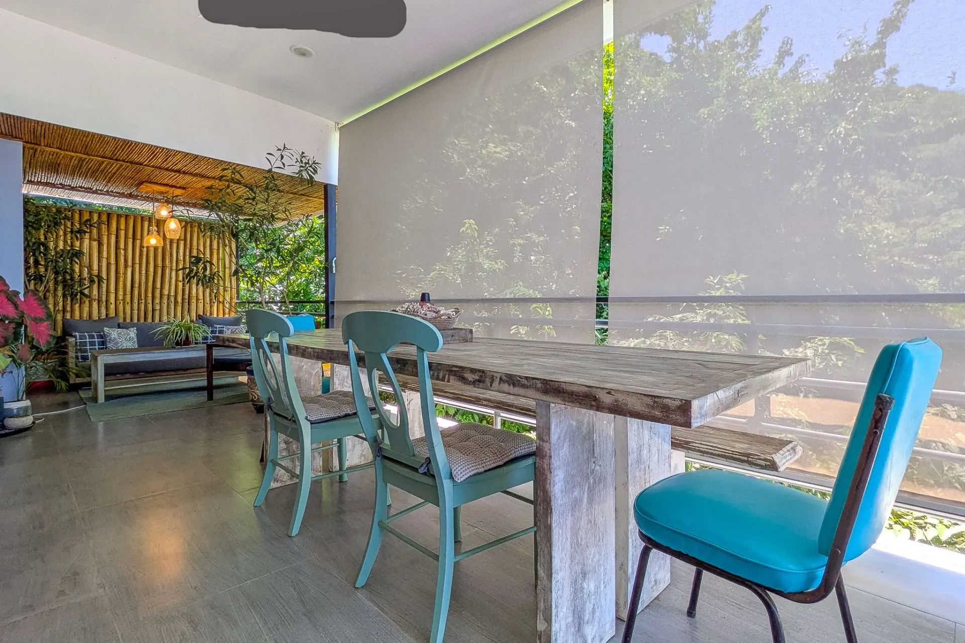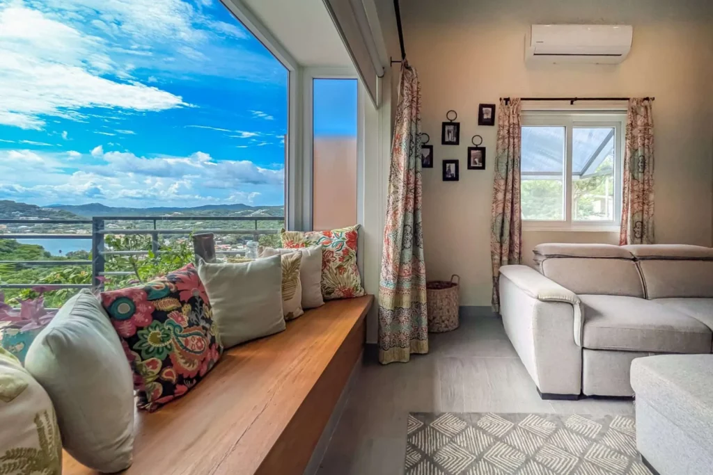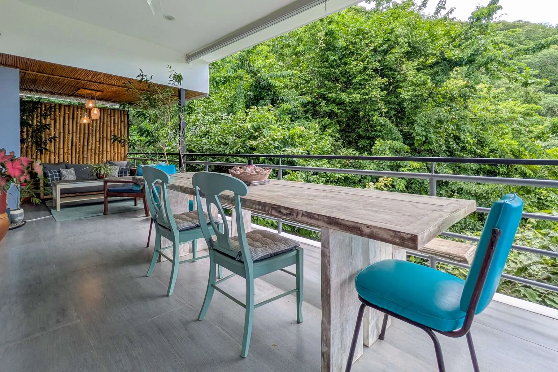 Sliding doors open the living space to an expansive covered deck. It’s a natural extension of the home—perfect for morning coffee, casual meals with friends, or a quiet afternoon hammock break while monkeys swing through the trees. At sunset, the outdoor space becomes your front-row seat to stunning colorful sunsets.