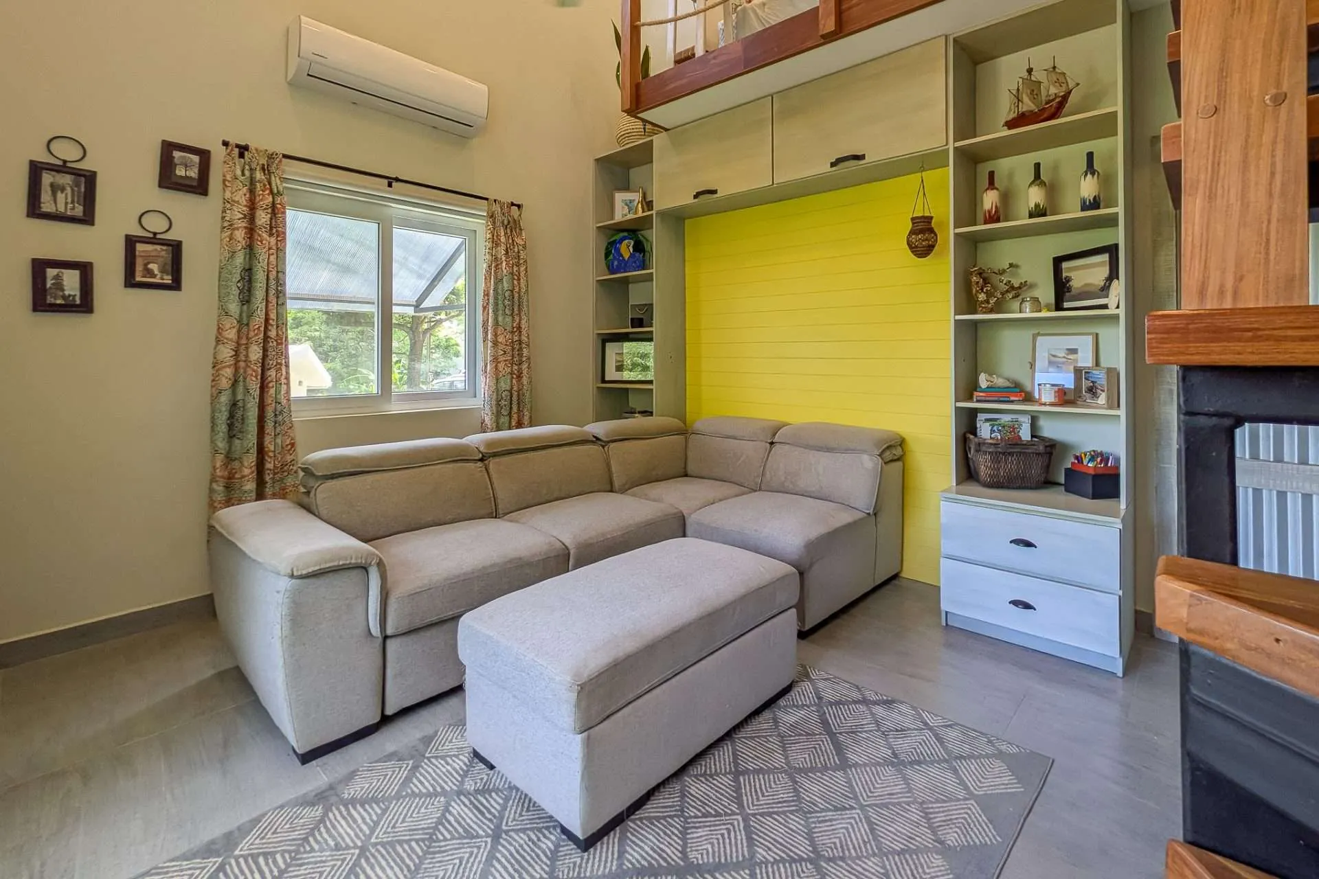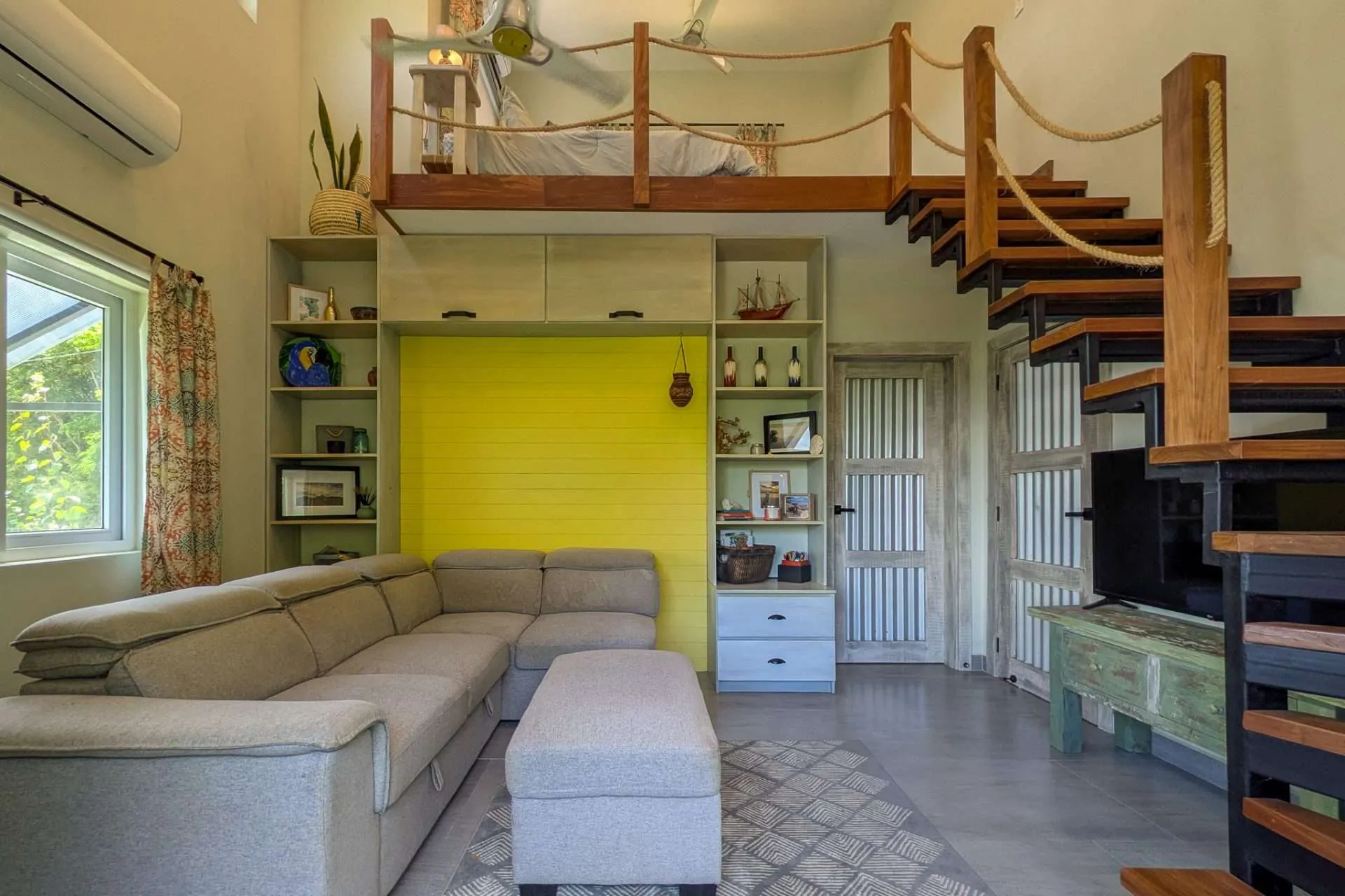 Bedrooms are positioned on opposite sides of the home for privacy, both with ensuite baths and air conditioning. A loft currently serves as the primary suite with a king bed, while the lower-level room functions as a TV lounge. With a sofa bed for extra guests, the layout also allows the primary bedroom to be moved to the main level if desired.